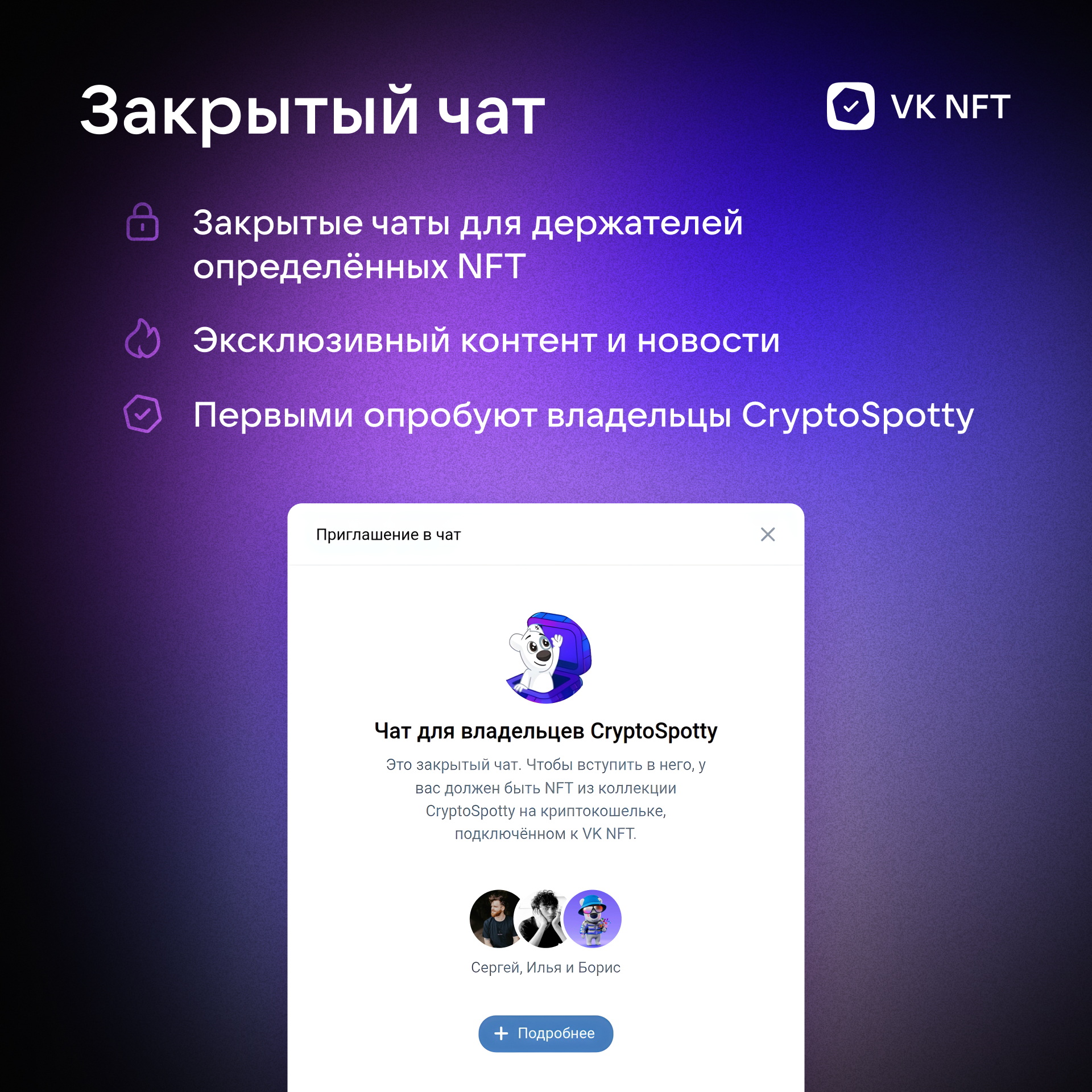NFT-чаты появились в результате открытого тестирования. Команда VK NFT собирает заявки от сообществ, которые первыми хотят использовать новый формат взаимодействия с пользователями. Когда NFT-маркетплейс будет запущен, создатели коллекций в качестве дополнительной ценности смогут сами создавать закрытые беседы для владельцев токенов. Сейчас в чат первой коллекции соцсети могут вступить держатели CryptoSpotty. В этом чате команда VK NFT будет в приоритетном порядке публиковать анонсы предстоящих дропов, проводить закрытые розыгрыши токенов, рассказывать о продуктовых планах, распределять доступ к следующим коллекциям и делиться эксклюзивным контентом.