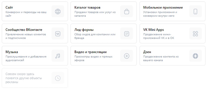 На сегодня вам доступно 9 различных целей. Это позволяет точно выстраивать стратегию рекламной кампании под конкретные задачи.