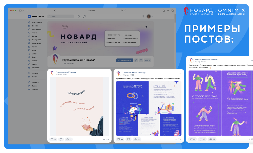 ГК «Новард» — это сеть магазинов стильной женской обуви и аксессуаров «Эконика», девелопер полного цикла «Сити21», коммерческая недвижимость НЭМЛ и поставщик оборудования «Рутектор». Клиент ведет корпоративный паблик и продвигается в ВК. Сообщество размещает бизнес-новости, затрагивает тему здоровых взаимоотношений с работой, публикует подборки книг, чек-листы по развитию навыков, мотивирующие постеры, вакансии, новости команды и другое.