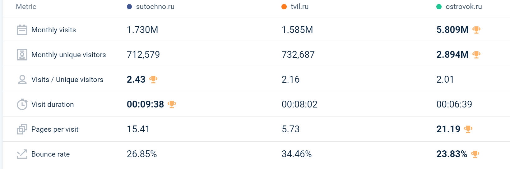 По данным сервиса SimilarWeb абсолютным лидером среди отечественных сервисов онлайн-бронирования является портал «Островок.ру». Количество ежемесячных пользователей сервиса в два раза больше суммарного количества пользователей Tvil и «Суточно.ру».