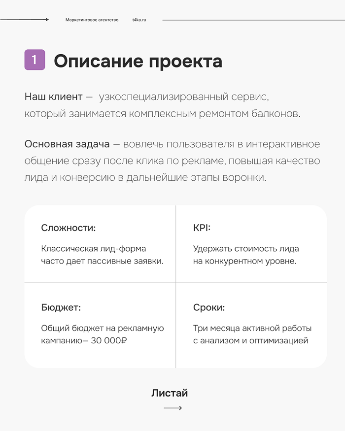 ЗадачаКлиенту требовались не просто лиды, а максимально «горячие» контакты, готовые к дальнейшему диалогу. Классическая лид-форма часто дает пассивные заявки, по которым сложно дозвониться. Задача состояла в том, чтобы вовлечь пользователя в интерактивное общение сразу после клика по рекламе, повышая качество лида и конверсию в дальнейшие этапы воронки.
