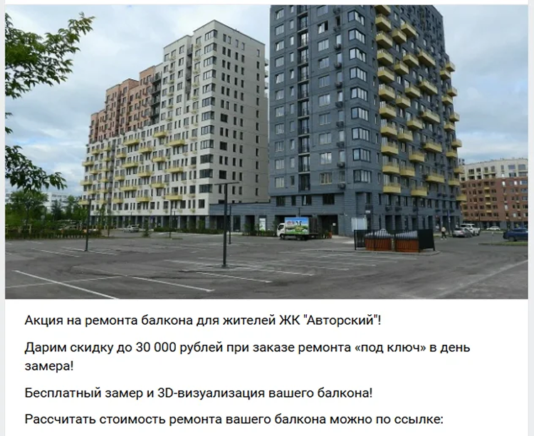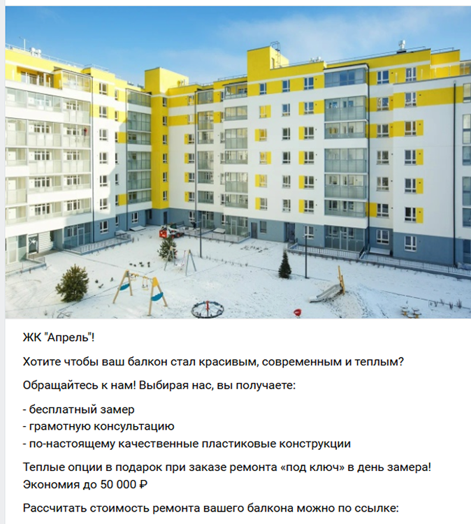 Креативы:Использовали самый наглядный и убедительный контент: фото и видео «До/После» и ролики с процессом монтажа (обшивка, установка окон), чтобы показать качество и скорость работы. В объявлениях по супергео добавляли фразу: «Делаем ремонт балконов в вашем районе»
