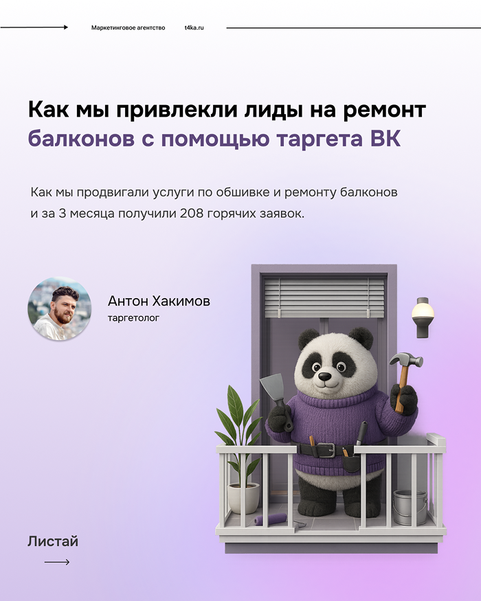 «Привет! Меня зовут Антон, я таргетолог. Помогаю строительным и отделочным компаниям превращать трафик из соцсетей в реальные договоры. В этом кейсе расскажу, как мы продвигали услуги по обшивке и ремонту балконов в Тюмени. Вместо классической лид-формы мы использовали прямой диалог с клиентом через чат-бота в сообщениях группы и за 3 месяца получили 208 горячих заявок.»