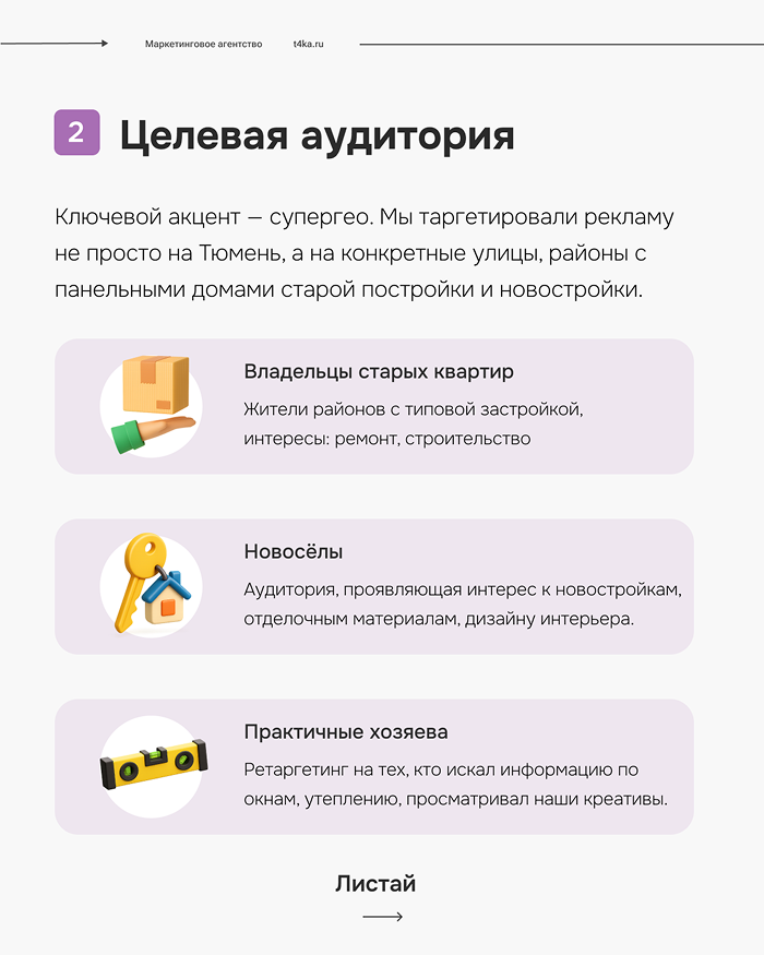 Мы сделали ставку на максимально точный таргетинг, чтобы чат-бот общался только с заинтересованной аудиторией, экономя время менеджеров.Ключевой акцент — супергео. Мы таргетировали рекламу не просто на Тюмень, а на конкретные улицы, районы с панельными домами старой постройки (где балконы чаще всего требуют ремонта) и новостройки, где люди делают отделку «с нуля».