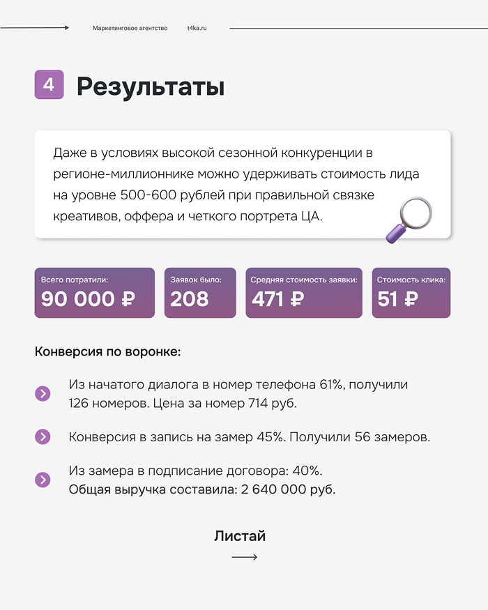 Сезонный оффер сработал. Сообщение о предстоящем повышении цен дало значительный импульс конверсии в конце августа. Даже в условиях высокой сезонной конкуренции в регионе-миллионнике можно удерживать стоимость лида на уровне 500-600 рублей при правильной связке креативов, оффера и четкого портрета ЦА.