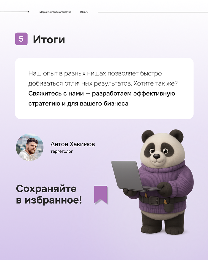 «Этот кейс наглядно демонстрирует, как грамотно спланированная и реализованная рекламная кампания может обеспечить значительный рост числа лидов при оптимальном использовании бюджета. Мы уверены, что наш опыт и профессионализм помогут вам достичь подобных результатов. Свяжитесь с нами сегодня, чтобы обсудить ваши маркетинговые цели и разработать эффективную стратегию для вашего бизнеса»