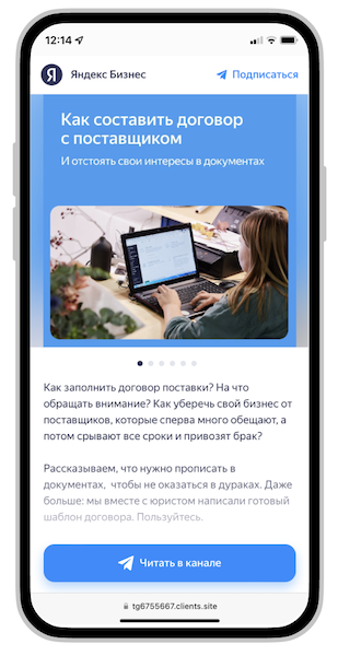 Объявление будет вести на специально сгенерированную страницу с двумя кнопками «Читать в канале» и «Подписаться». Эта страница поможет понять системе, интересна ли тема посетителю, и точнее таргетироваться на аудиторию.