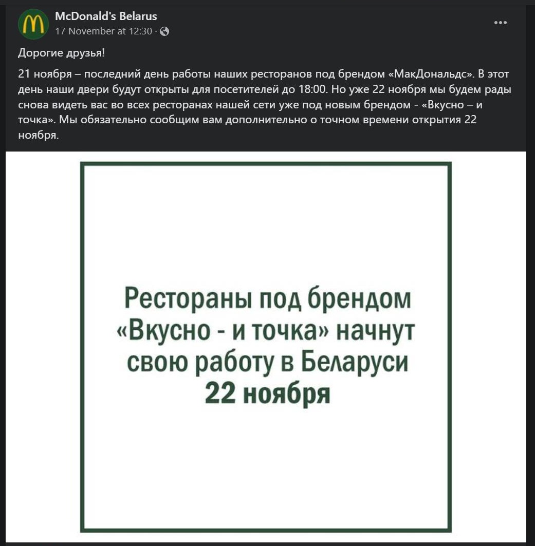 Также 11 ноября эта информация была подтверждена на официальной странице «McDonald’s Belarus» в Facebook*. В следующем посте, датированном 17 ноября, сообщалось, что 21 ноября будет последним днем работы белорусских ресторанов сети под брендом «Макдоналдс». «Уже 22 ноября мы будем рады снова видеть вас во всех ресторанах нашей сети уже под новым брендом — „Вкусно — и точка“, — говорилось в сообщении.