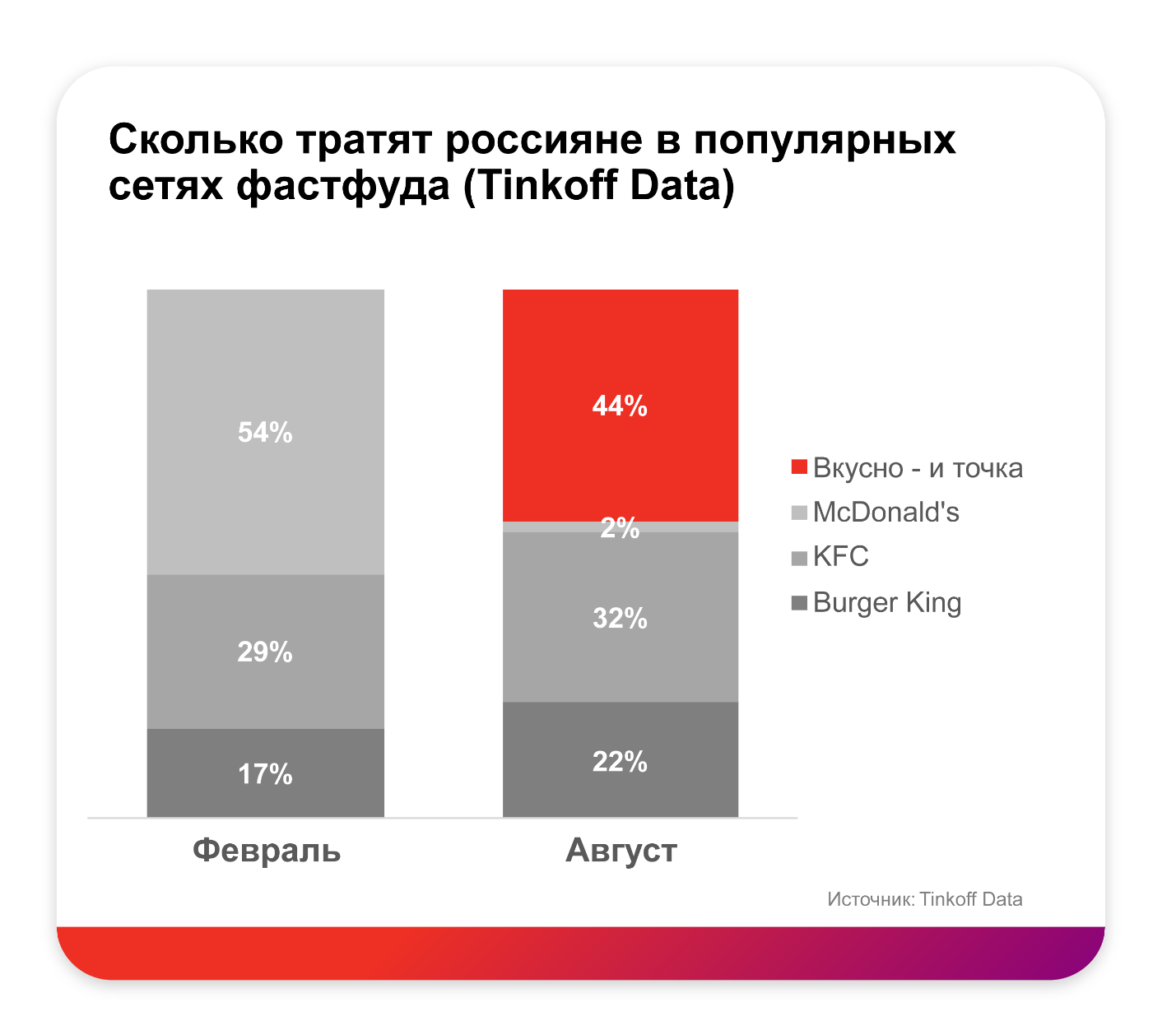 Результат, к которому привели эти 4 составляющие, можно увидеть на сентябрьских данных Tinkoff Data. В августе — когда еще не были открыты все заведения «Вкусно — и точка», когда еще не была запущена доставку — доля трат в новой сети приблизилась к февральскому уровню ее предшественника.