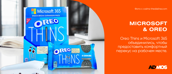 Oreo Thins и Microsoft 365 создали совместный проект, чтобы помочь сотрудникам компаний устроить идеальный перерыв на перекус. Виртуальный ассистент Microsoft Clippy автоматически бронирует в календаре 15-минутный перерыв для каждого сотрудника, чтобы он мог отдохнуть, сосредоточиться и насладиться печеньем Oreo.