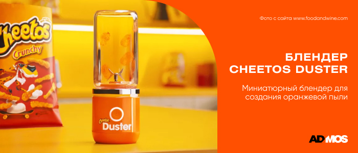 Специально для любителей Cheetle бренд создал миниатюрный блендер, в котором можно размолоть снеки до состояния пыльцы. Cheetos Duster — яркий оранжевый гаджет: обязательно пригодится на кухне и станет ярким акцентом в её интерьере.