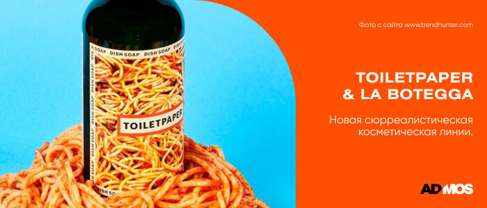 Журнал Toiletpaper, известный своими провокационными фотографиями, анонсировал запуск новой сюрреалистичной линии косметики в сотрудничестве с итальянским брендом La Bottega. Теперь в Интернет-магазине журнала Toiletpaper Beauty доступен новый раздел с косметикой, мылом и прочими ароматными радостями. Этикетки этих товаров украшены причудливыми узорами из спагетти и томатного соуса, что является отсылкой к основному принципу бренда: «Дом — это место, где можно позволить себе уронить помидор на рубашку или съесть спагетти руками».