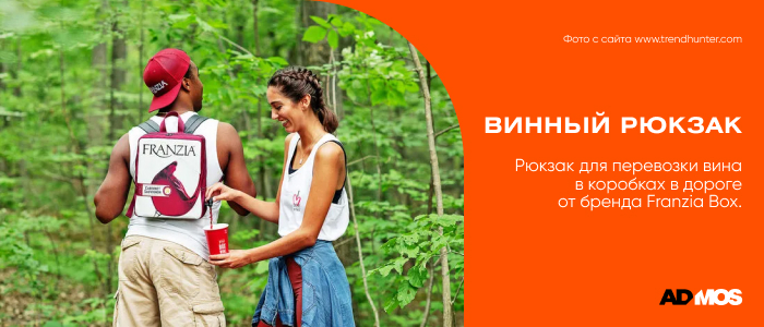 Компания по производству коробочных вин Franzia выпустила рюкзак для перевозки вина в коробках в дороге. Тетрапак идеально помещается в рюкзак, а носик сбоку позволяет удобно наливать вино на ходу. В рюкзак помещается пятилитровая упаковка вина Franzia, а это — около 34 бокалов. Друзей с собой можно позвать много, а прогулка получится долгой и однозначно веселой.