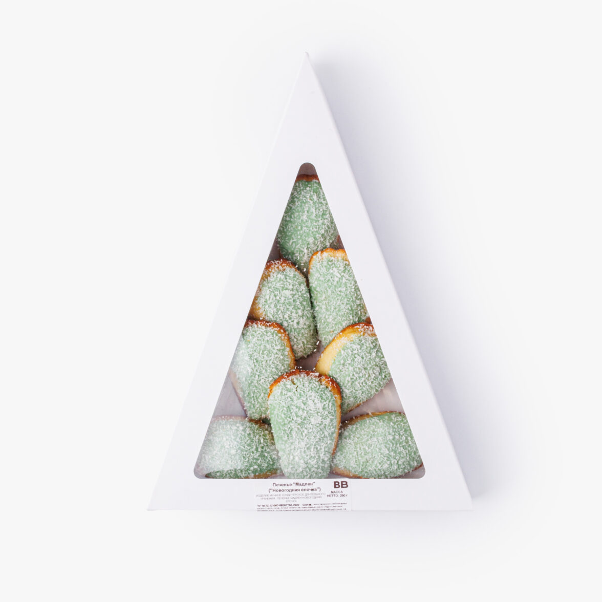 Набор классического французского печенья в форме маленьких ракушек в треугольной коробке, напоминающей ёлочку. Сверху лакомство покрыто шоколадом с натуральными красителями и посыпано кокосовой стружкой, что делает его похожим на праздничные украшения.