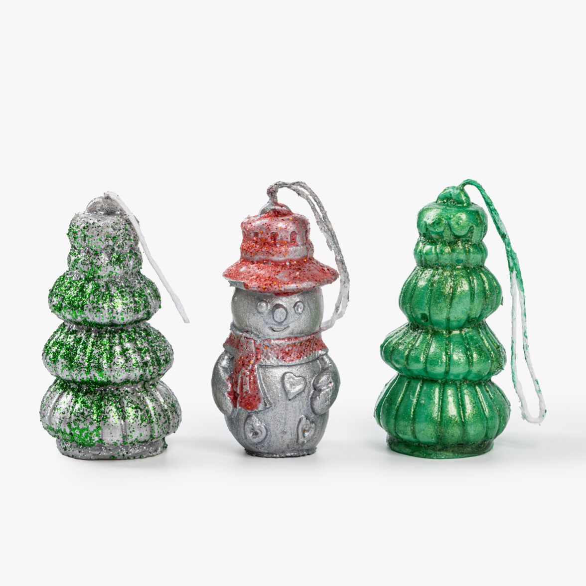 Набор небольших декоративных свечей в форме игрушек – снеговика и ёлочек. Смесь кокосового, соевого воска и очищенного парафина горит мягким, устойчивым пламенем без резкого запаха.