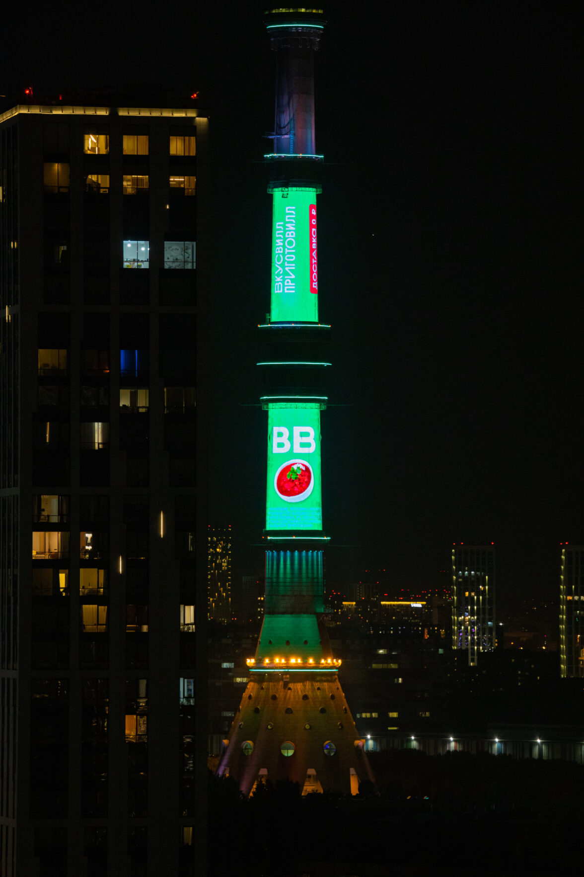 Подготовка оказалась нетривиальной: у башни особые технические требования, и макет пришлось тщательно адаптировать. Но команда дизайнеров справилась — и реклама загорелась на высоте более 300 метров.