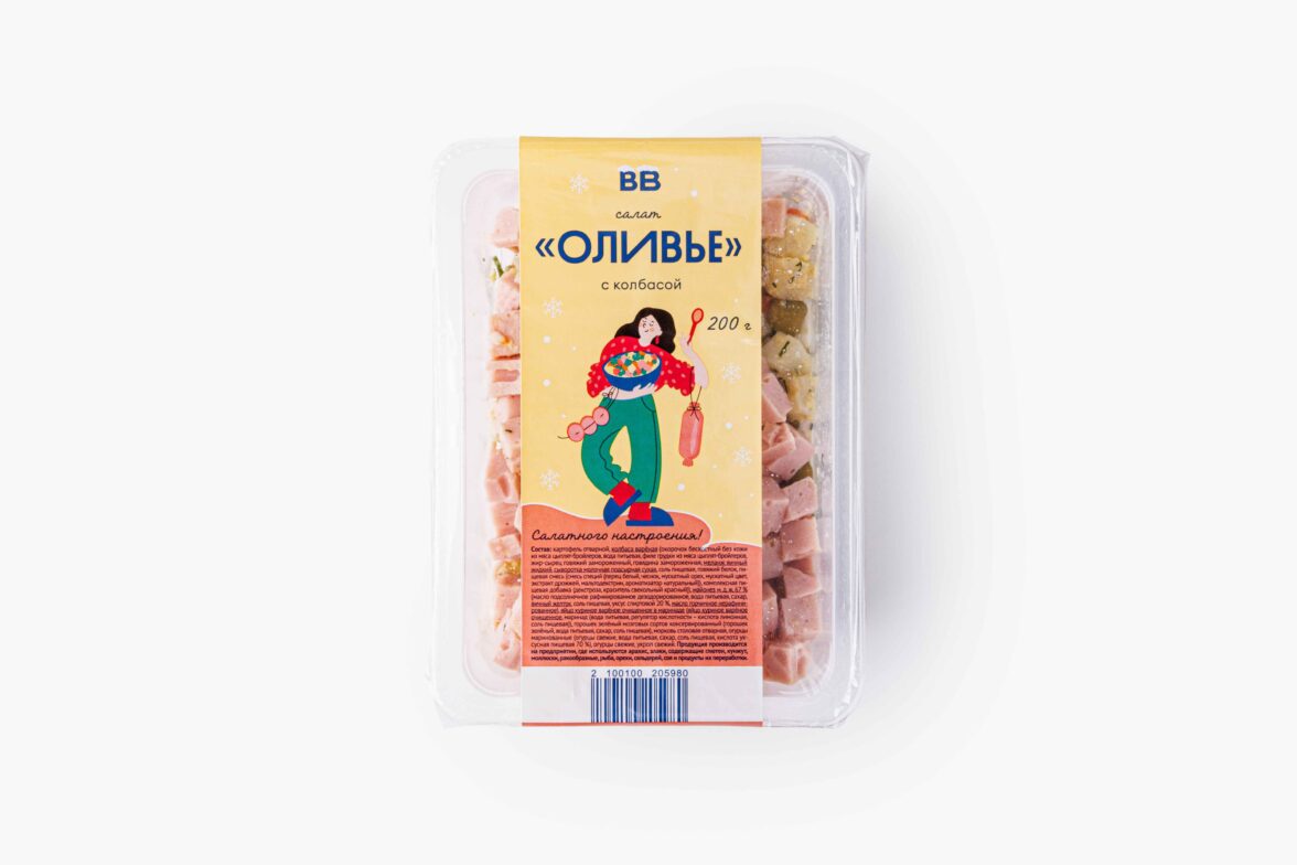 Лидер по редизайну — кулинария. Более 120 SKU, включая салаты (оливье, винегрет, сельдь под шубой, мимоза), вторые блюда и закуски, оформлены с зимней символикой: снежинками, сугробами, образами покупателей, наслаждающихся зимой. На этикетках зимней кулинарии также размещены поздравления от ВкусВилла: «Салатного настроения!», «Вкусного года!», «Вкусных встреч!» и «Года со вкусом!».