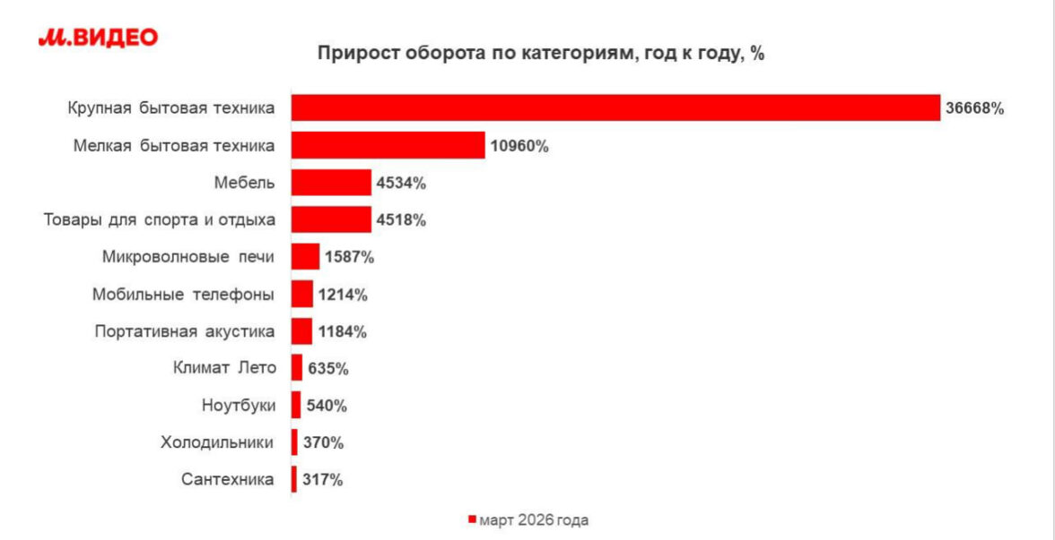 Положительная динамика сохраняется и в ключевых цифровых категориях. Оборот компьютеров вырос на 246% год к году, умных часов — на 192%, планшетов — на 171%, ноутбуков — на 156%, а продажи мобильных телефонов увеличились на 102%. В марте по сравнению с февралем в этих сегментах также зафиксирован рост, что отражает стабильный спрос на цифровую технику.