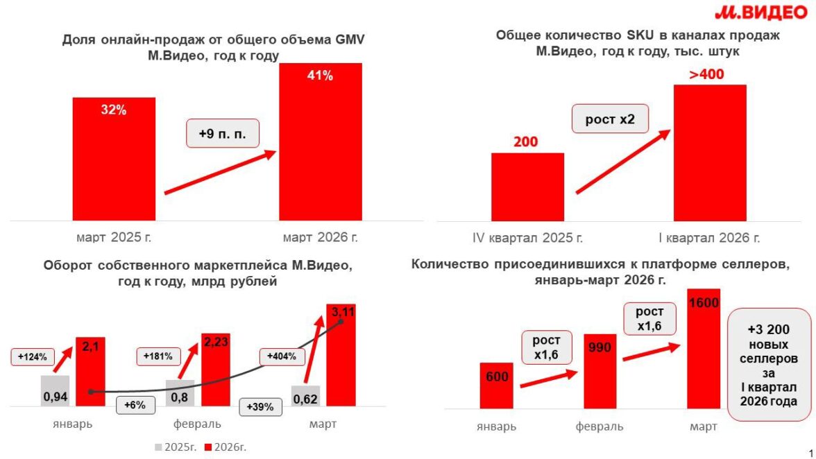 «М.Видео сегодня — это уже не просто сеть магазинов, а платформа, которая объединяет онлайн и офлайн в единую систему. По итогам первых трех месяцев оборот платформы маркетплейса превысил 7,4 млрд рублей, увеличившись более чем в 3 раза год к году, а доля онлайна выросла с 33% до более 40%. При этом мы видим не только высокий годовой рост, но и последовательное ускорение динамики: в марте оборот превысил 3,1 млрд рублей, показав рост на 39% к февралю.