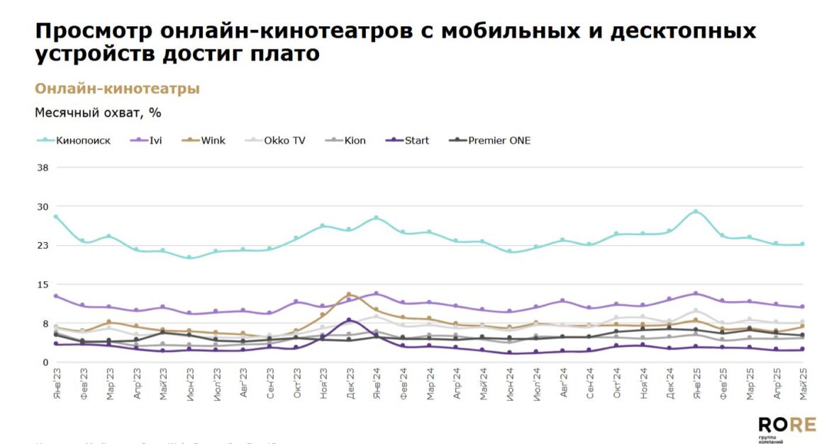По данным рекламной группы «Родная речь», представленным в июне на конференции «Изменение медиаландшафта», месячный охват крупнейших российских онлайн-кинотеатров не увеличивается с января 2024 года, аудитория онлайн-видео драматично снижается. Потребители предпочитают видео маркетплейсы и TikTok, дневная аудитория которых за год выросла на 15%.