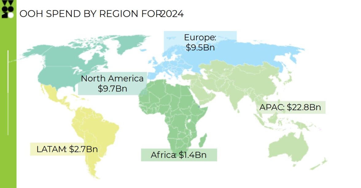 Рынок рекламы вне дома не похож на общемировую рекламную индустрию тем, что главенствующую роль на нем занимает не Северная Америка, а Азиатско-Тихоокеанский регион. На него в 2024 году пришлось 49% общемировых затрат в этом медиа — $22,8 млрд при доле 40% в мировом ВВП. Северная Америка на втором месте с $9,7 млрд и 22%. Замыкают пятерку Европа ($9,5 млрд), Латинская Америка ($2,7 млрд) и Африка ($1,4 млрд). Во всех регионах помимо Азии доля ВВП от общемирового больше, чем доля OOH.
