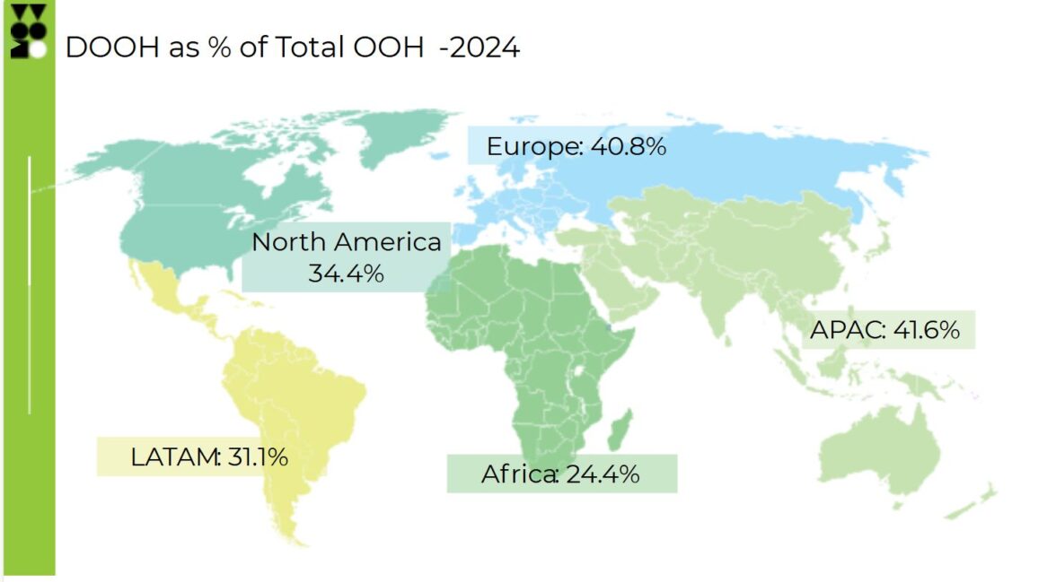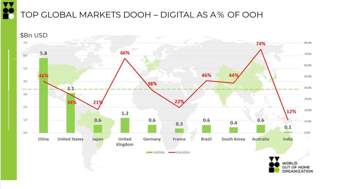 Драйвером роста мирового рынка рекламы вне дома, по данным WOO, является цифровой сегмент — DOOH (Digital Out-Of-Home). В среднем по миру его доля во всех расходах на рекламу вне дома составила в 2024 году 39%. Лидерами по развитию цифрового сегмента является Австралия — 74% от общей выручки в OOH приходится на DOOH, Великобритания (66%), Китай (46%), Бразилия (46%) и Южная Корея (44%).