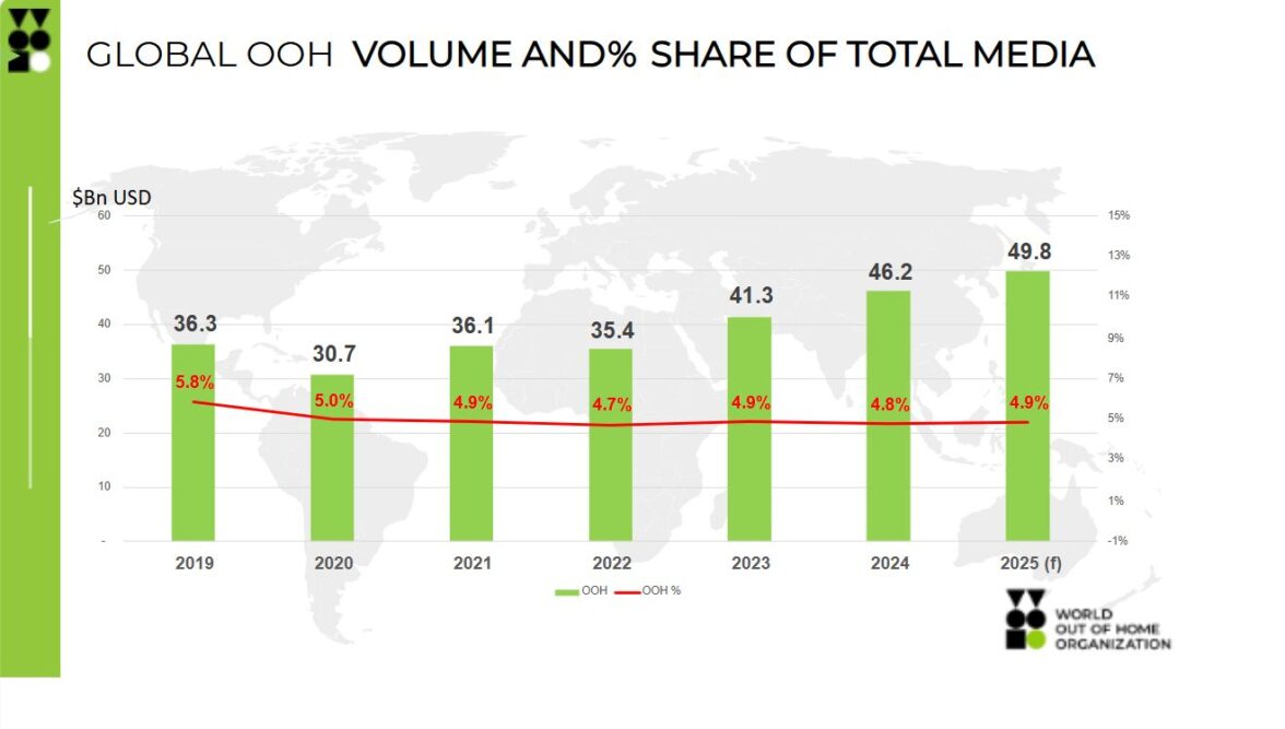 Динамика рынка OOH будет выше роста объемов мировой рекламы в целом. В 2025 году, по усредненным данным крупнейших мировых рекламных групп и WARC глобальный рекламный рынок вырастет на 5,5%.