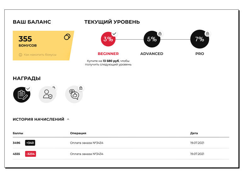 В личном кабинете реализовали страницу, где пользователю отображается его текущий уровень бонусной программы с текущим уровнем скидки и суммой, оставшейся до перехода на следующий уровень, а также историей начисления баллов: