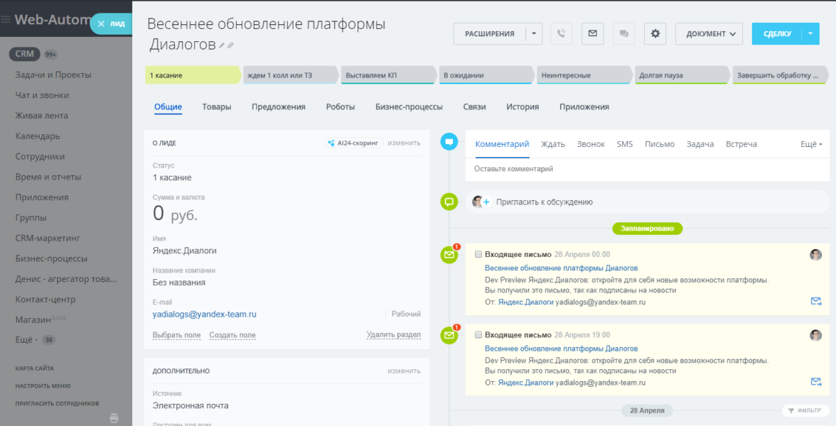 • В целом концепцию Лиды и Сделки считаю неудачной. Сделка по сути лишняя сущность. Есть потенциальный клиент и просто клиент. Все остальное — лишнее усложнение. Особенно учитывая, что у лида и у сделки есть свои статусы.