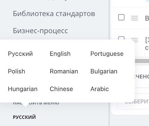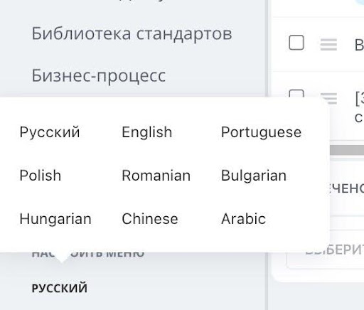 «Битрикс24» из «коробки» не позволяет выбирать язык интерфейса. Но «МИР ИНСТРУМЕНТА» — многонациональная и мультиязычная компания с сотрудниками по всему миру. Поэтому мы написали внутренний отдельный модуль, который через Яндекс Переводчик адаптирует весь интерфейс под выбранный язык. Всего доступно 9 языков, включая китайский.