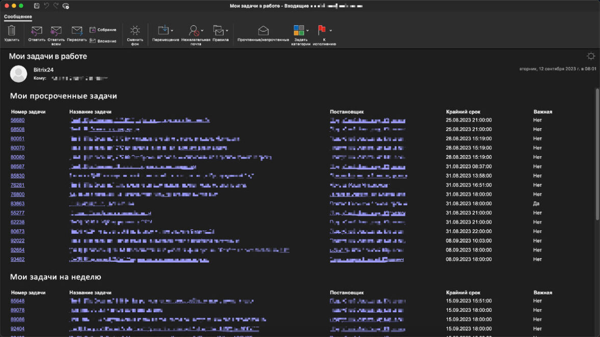 Регулярные оповещения с задачами. На портале каждое утро всем сотрудникам приходят рассылки с задачами: в работе с разбивкой по срокам, ожиданию контроля (надо принять), а также список просроченных задач, в которых пользователь значится постановщиком.