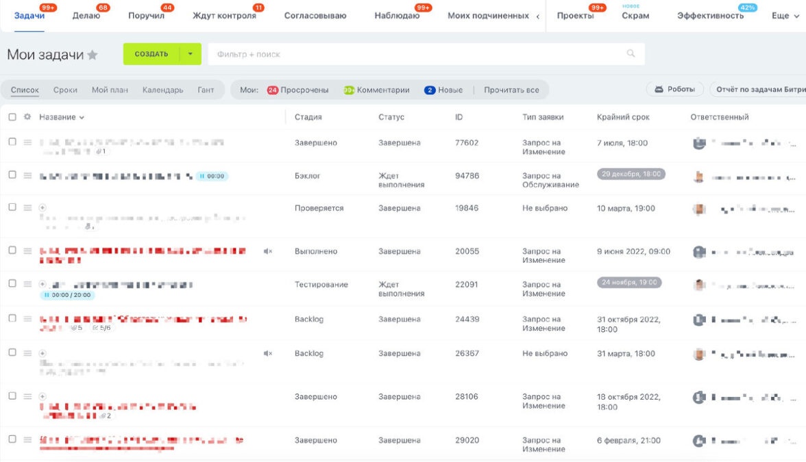 Блок фильтров задач. Полностью переписали логику счетчиков просроченных задач, потому что раньше они могли подсчитываться некорректно и даже теряться. Для этого мы сделали скрипт с фильтрами, который, например, позволяет раскрывать задачи на подзадачи. Также добавили функциональность в фильтре по закрытым задачам, который зачеркивает красным задачи, выполненные позднее установленного дедлайна. А ещё сделали счетчик переноса крайних сроков — теперь можно увидеть, сколько раз был сдвинут дедлайн в задаче.