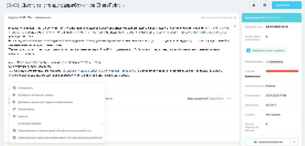 Добавление новой задачи с копированием. В соответствии с процессами клиента сделали так, что возобновить задачу нельзя — это нарушает логику стадий и подсчета времени. Поэтому можно создать подзадачу с автоматическим копированием всех параметров родительской сущности — описания и даже комментариев.