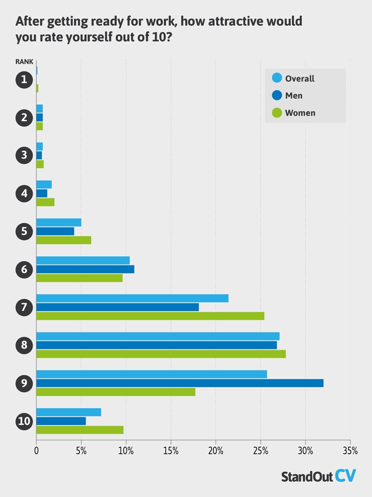 Большинство опрошенных не только верит в «привилегию красоты», но и считает себя привлекательными. Среднестатистическая оценка, которую участники исследования поставили своей внешности после подготовки к рабочему дню — 7,7 баллов из 10 возможных. Мужчины чаще считают себя чрезвычайно привлекательными, чем женщины. 37,5% мужчин оценили себя на 9 баллов или максимальные 10 баллов. Только 27,4% женщин поставили себе такие оценки.