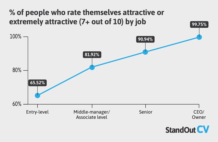Успешные люди более чем склонны считать себя привлекательными. Так, среди тех, кто занимает низовые должности, считают свою внешность привлекательной 65,52%, тогда как почти все (99,75%) из генеральных директоров оценили себя как минимум на 7 баллов. Чаще даже выше. 71% гендиректоров оценили свою внешность на 9 или 10 баллов, притом что средний показатель по исследованию — 33%. Исследователи отметили явно выраженную корреляция между продвижением по карьерной лестнице и тем, как человек оценивает свою привлекательность.