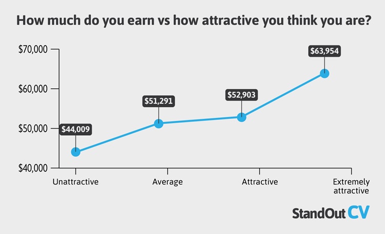 Респонденты, оценившие себя как чрезвычайно привлекательных, зарабатывают в среднем на $19 945 больше, чем те, кто оценил себя как непривлекательных ($63 954 против $44 009).