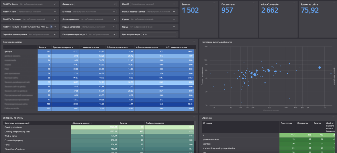 В мире DataLens гарантированная интеграция с «Яндекс Метрикой» — это не просто возможность, а ключ к максимальной гибкости в работе с данными. Мы не просто вращаем цифры «Метрики» через DataLens, мы создаем инструмент, который позволяет вам мастерски манипулировать данными. И представляем себе дашборд, на котором можем легко нарезать информацию по уровням UTM-меток, географии, датам, устройствам, целям и действиям.