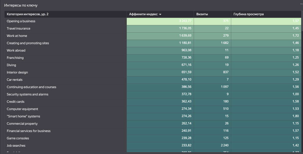 В идеале, конечно, было бы создать сводную таблицу, где интересы расположены по строкам, UTM-метки — по столбцам, а внутри указан аффинити-индекс. К сожалению, попытки создать такую таблицу в дашборде завершаются нулевыми значениями. Однако можно воспользоваться решением этого вопроса вручную через Excel или напрямую через API.Если мы возвращаемся к селекторам, то там имеется возможность провести обратную фильтрацию, выбрав категории интересов. В таком случае таблица отобразит ключи и людей с соответствующими интересами, предоставив более наглядное представление. Просто переверните таблицу с верху вниз для получения нужного отображения данных.