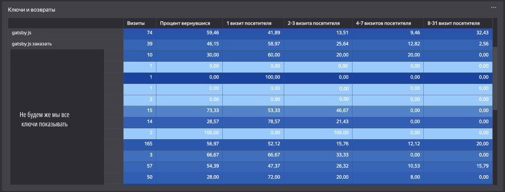 Здесь представлена таблица, отображающая количество визитов по ключевому слову и процент пользователей, возвращающихся на сайт. Также присутствуют группировки по общему количеству визитов.