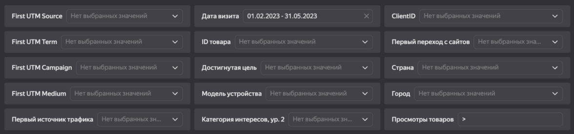 Дашборд позволяет формировать собственные селекторы для фильтрации данных по вашим требованиям. В фильтрацию можно включить разнообразные параметры, включая ClientID. В фильтрах можно указывать несколько значений, что приведет к автоматической фильтрации всех данных на странице дашборда.