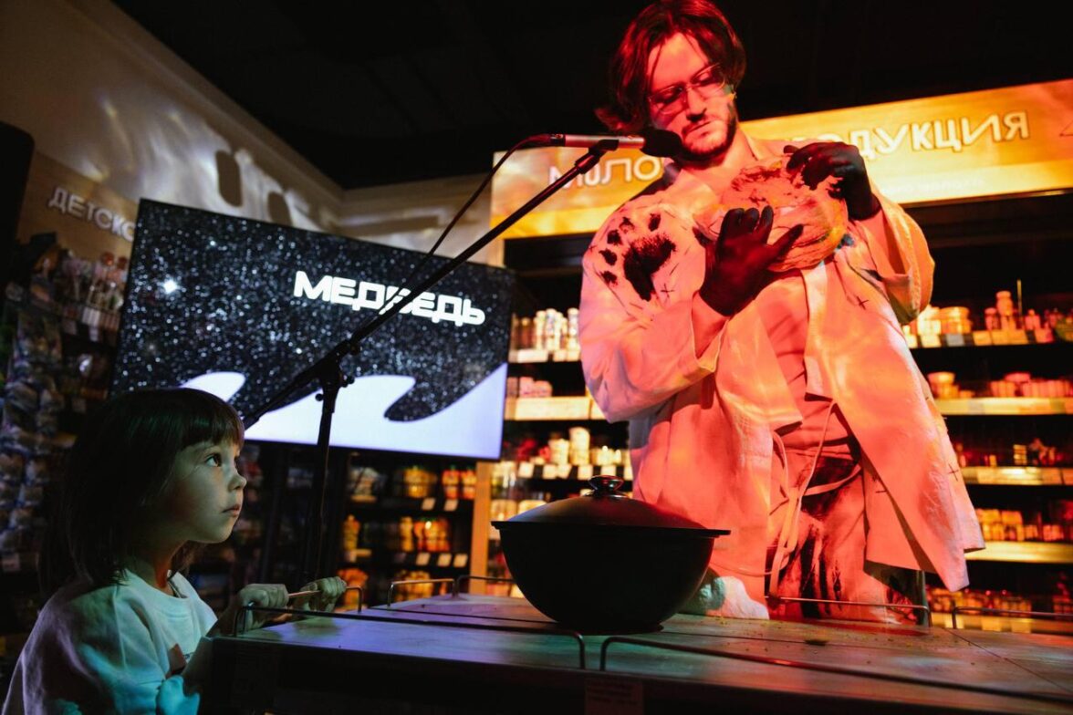 Флагманский магазин превратился в сцену: зрители отправились в путешествие за Колобком прямо между полок. Привычное пространство, где мы обычно берём хлеб и молоко, превратилось в театральную площадку — с актёрами, музыкой и настоящим финалом у печи.