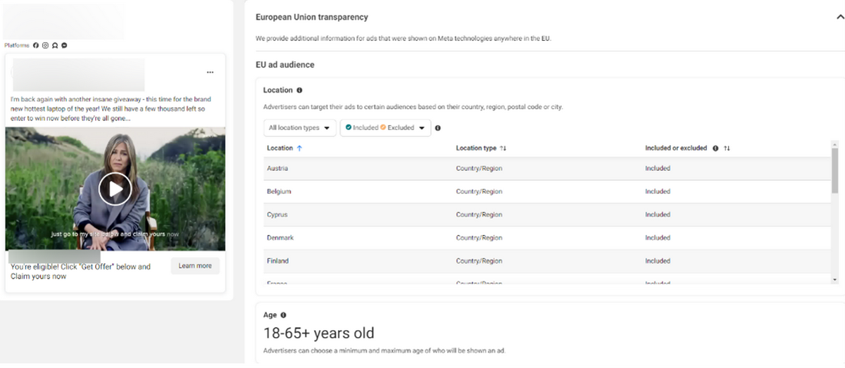Анализ мошеннических рекламных кампаний, где использовалось дипфейк-аудио, показал, что обычно они таргетируются как минимум на 1 млн пользователей соцсетей Meta из США и Европы, в том числе на Францию, Австрию, Бельгию, Португалию, Испанию, Польшу, Швецию, Данию, Кипр, Нидерланды и Румынию.