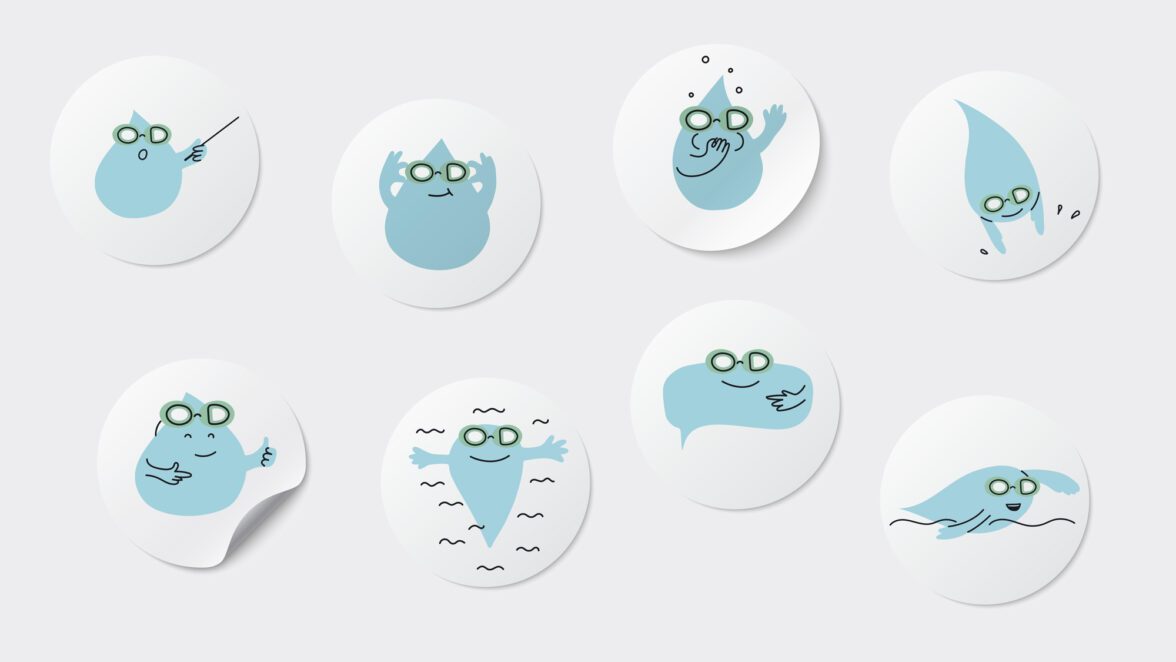 Помимо логотипа, мы разработали целый комплекс атрибутики, включая мешочки для принадлежностей, дипломы, переводные тату и стикеры. Каждая деталь была тщательно продумана, чтобы поддерживать общий стиль и настроение бренда. Главный герой — голубая капля, которая как будто за ручку ведет ребенка в этот новый, удивительный водный мир. Этот образ стал символом заботы и помощи, что особенно важно для первых шагов детишек к воде.