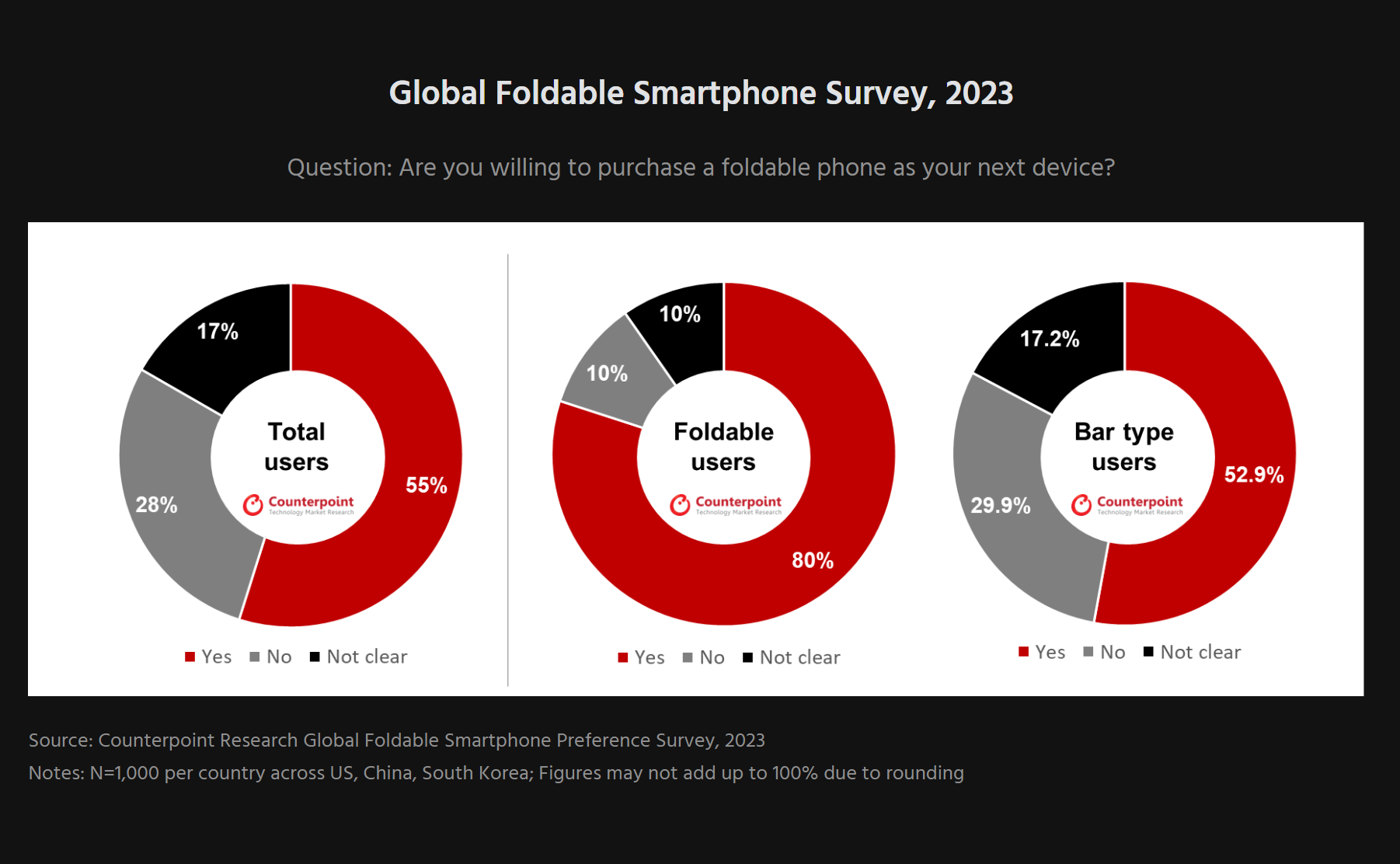 Согласно статистике, большинство (55%) владельцев согласны сменить свою «лопату» на этот пока еще примитивный трансформер. Попробовавшие «умные раскладушки» других телефонов себе уже и не представляют. У 80% таких потребителей следующий смартфон будет складным. Со временем к ним могут прибавиться и 52% владельцев классических мобильных гаджетов, которые готовы обновить свое устройство на гибкое.