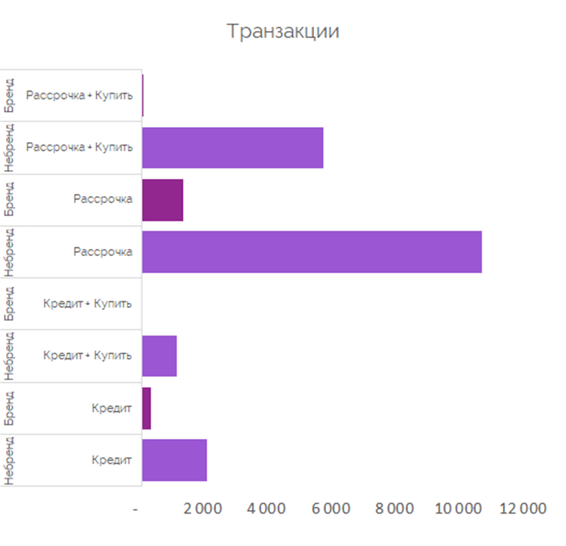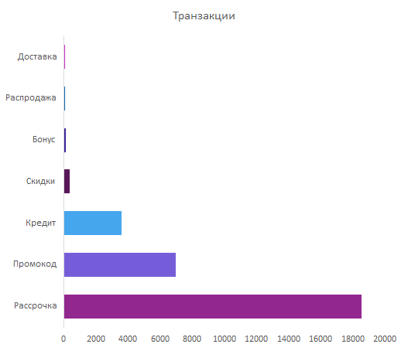 На диаграмме мы можем увидеть, что наибольшее количество транзакций приносят ключевые фразы с приставками «рассрочка», «кредит», «промокод».