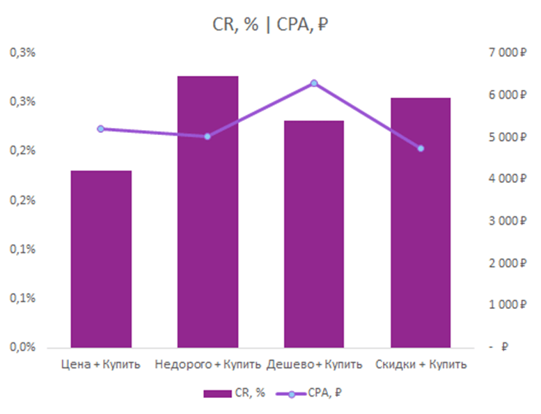 Микс-приставки «купить недорого», «купить дешёво», «скидки» снижают CR (среднее значение CR по приставке «купить» — 0,8%) и увеличивают CPA.