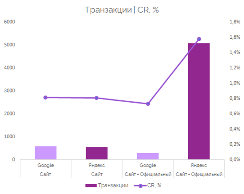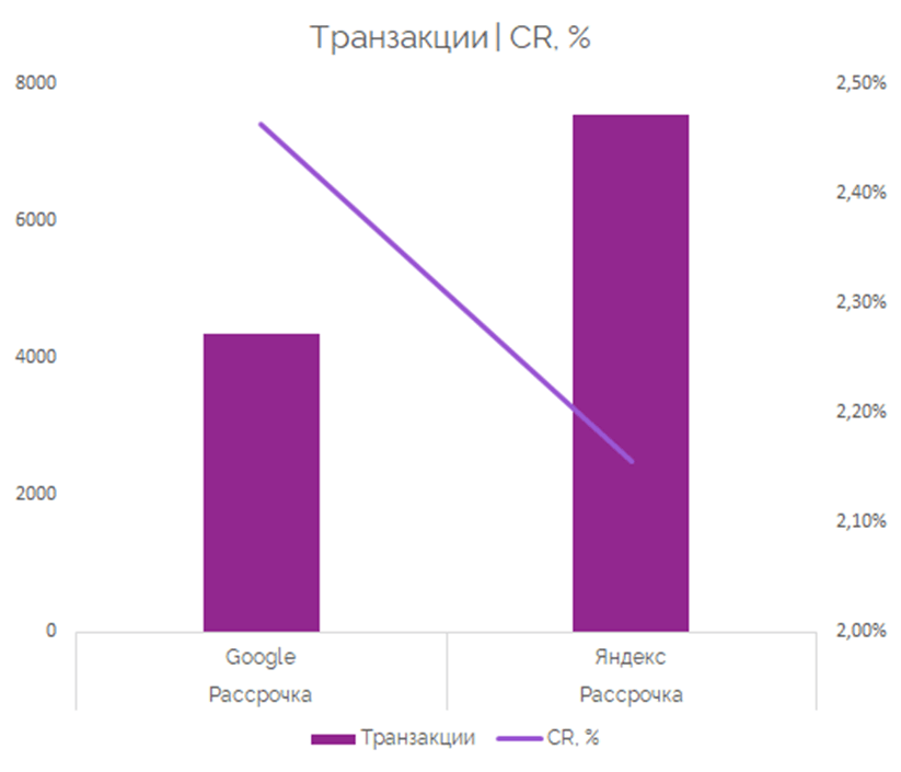 Яндекс приносит большее количество транзакций, Google — приносит больший CR%.