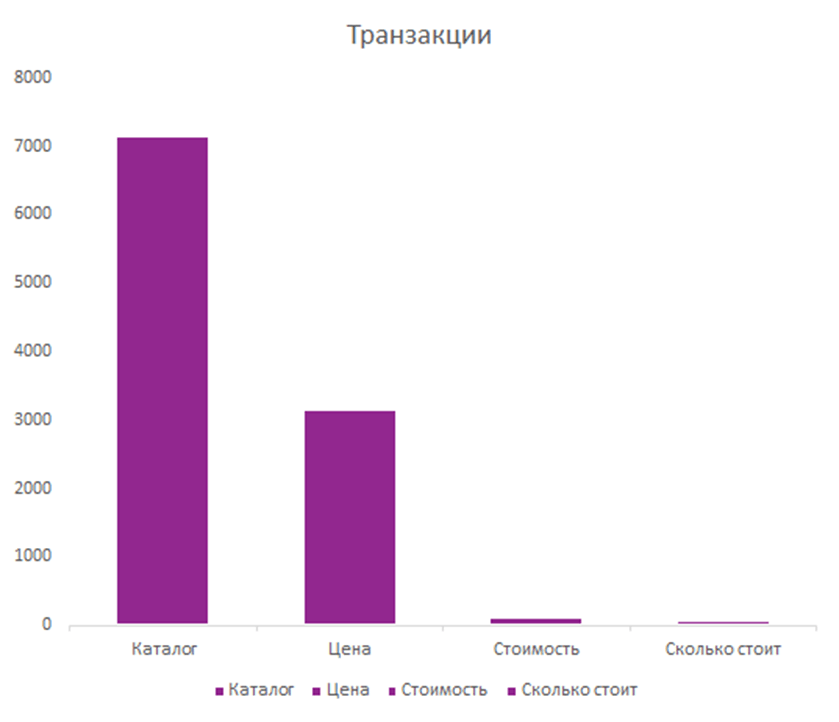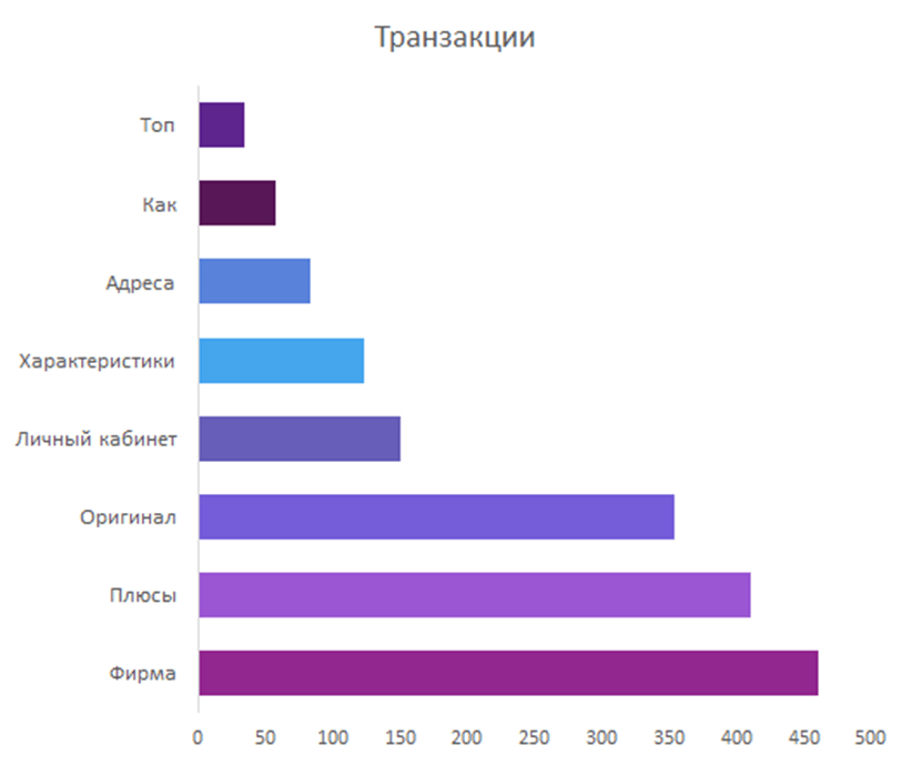 Примерно ⅔ всех транзакций приходится на запросы с геодобавками, дополнительными характеристиками (цвет, материал, размер) и так далее. Такие слова мы исключили из нашего анализа. Оставшиеся запросы содержат ключевые фразы с условно транзакционными и информационными приставками, они и представляют особый интерес для анализа.