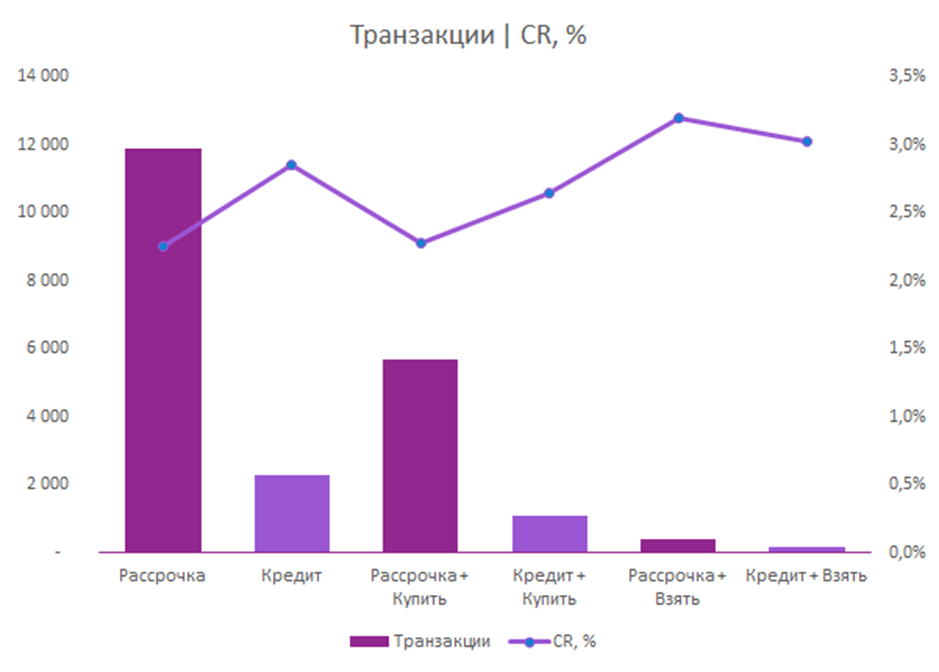 Моноприставка «рассрочка» приносит наибольшее количество транзакций при CR — 2,3%. Наименьшее количество транзакций — микс-приставки с добавкой «взять».