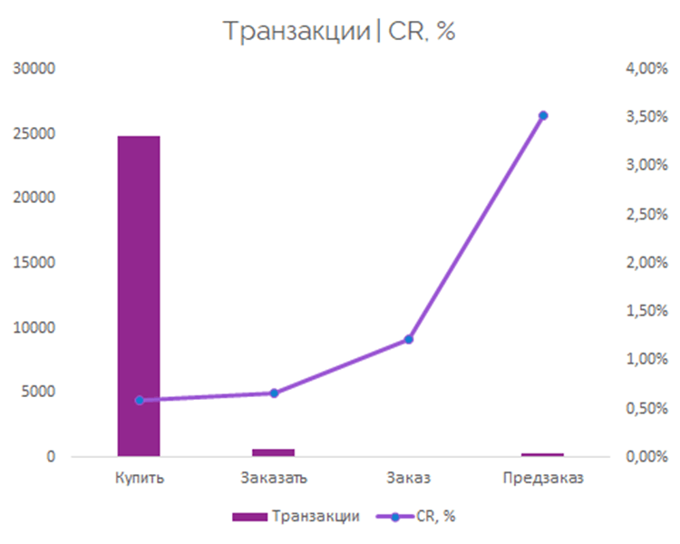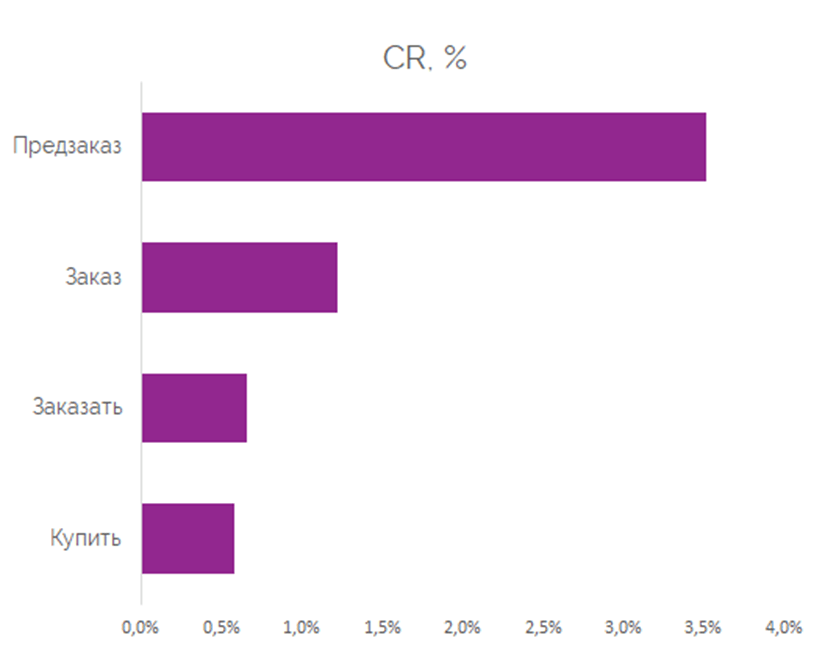 Приставка «купить» приносит наибольшее количество транзакций, в то время как «предзаказ» — максимальный CR.
